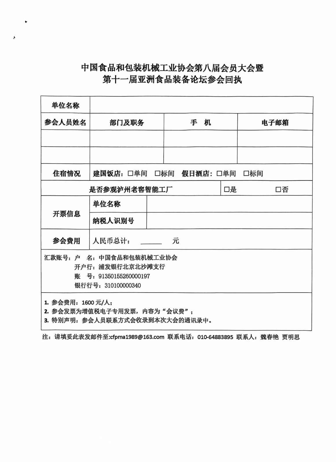 關于召開中國食品和包裝機械工業協會第八屆會員大會暨第十一屆亞洲食品裝備論壇等系列活動的通知
